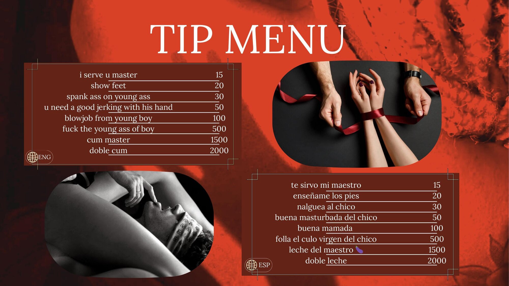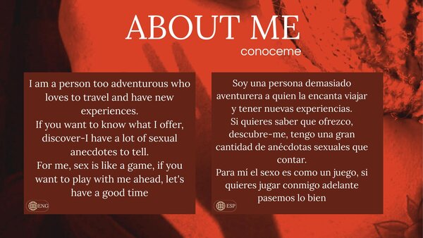 Hola chicos, me gusta disfrutar de todo, me gusta ser una maestra muy fuerte y sexy, no quiero hombres groseros o tacaños, el placer es el arte más complejo para disfrutar de todo, me gusta ver como mi sumisa es divertida mientras doy placer con mis manos y me encanta ver cómo se a mi sumisa